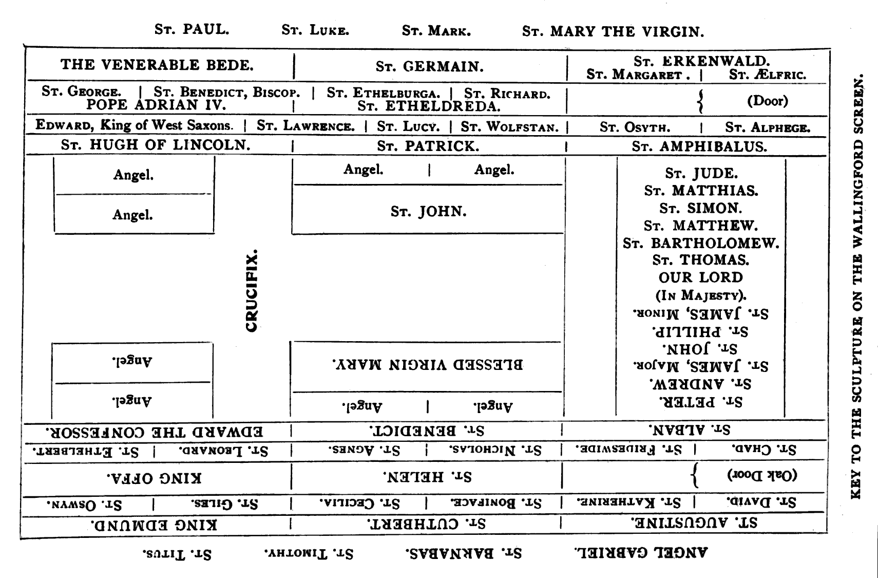 One piece of modern restoration was not done by Lord Grimthorpe, namely that of the Wallingford screen behind the high altar. The statues on this having been destroyed and the screen itself damaged, Mr. H.H. Gibbs, now Lord Aldenham, offered to restore it, working under Lord Grimthorpe's faculty. After a time a dispute arose between them, chiefly over the introduction of a statue of Christ on the Cross in the centre of the screen, and the erection of an altar with a stone top below it. This led to a lawsuit, the final result of which was that Mr. Gibbs was allowed to finish the screen in his own way, but not to do anything to any other part of the church, a thing he wished to do. The altar is not yet in position; when this is placed where it is intended to stand, the work of restoration will be complete, and nave, choir and presbytery, and Lady Chapel will then alike be capable of being used for service, forming in reality three distinct and fully fitted churches under one roof, the retro-choir being intended for use as a chapter-house whenever a chapter shall be created.