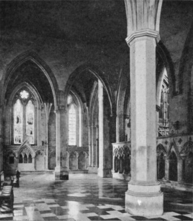 On entering by the west door a peculiarity will at once be noticed. About fifteen feet from the inner side of the west wall there is a rise of five steps which stretch right across the church from north to south. The floor to the east of these steps slopes imperceptibly upwards for eight bays, when a rise of three more steps is met with. On this higher level stands the altar, which is backed up by the rood screen. There is another step to be ascended to the level of the choir, and another to reach the space below the tower. Five steps lead from this into the presbytery; there is another step at the high altar rails, and four more lead up to the platform on which the high altar will stand. From the space below the tower one step leads up into the north aisle and two more into the north arm of the transept. From the level of the south choir aisle and south transept two steps lead up into the south aisle of the presbytery; from this aisle there is a rise [Pg 36]of four steps into the aisle south of the Saint's Chapel, and from this into the chapel itself a rise of four more. So that the floor of this chapel is, with the exception of the high altar platform, which is one step higher, the highest in the whole church, or nineteen steps above the floor just inside the west door. From the aisle of the Saint's Chapel one step leads into the retro-choir, and two more into the Lady Chapel; hence the floor of the Lady Chapel is one step lower than that of the Saint's Chapel. If we take seven inches as the average height of a step, it would appear that the floor of the Lady Chapel is about ten feet higher than the floor at the west end of the nave.