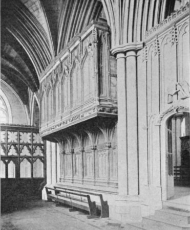 The two parts of the church that are ordinarily in use are the Lady Chapel, where morning and evening prayer is said daily on week-days, and the nave, which is used for the Sunday services. There is at present no high altar in place under the great screen, but one will probably be placed there as soon as the final touches are put by Mr. Gilbert to the carved work of the reredos. The choir proper is not, however, capable of holding a large congregation. It was, of course, originally intended to hold the monks only. The part eastward of the stalls might on special occasions, such as the enthronement of a bishop, the installation of a dean, be temporarily fitted with chairs, but it is not likely that any permanent seats will be placed here, since as a matter of fact the nave and Lady Chapel answer all ordinary requirements.