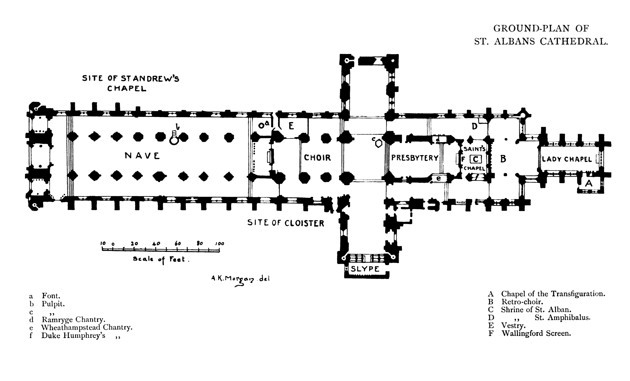 My best thanks are due to the Dean for kindly allowing me permission to examine every part of the Cathedral church, and to take the photographs with which this book is illustrated. A few illustrations only are from other sources, among them those on pages 9 and 11, for permission to use which I have to thank Mr. John Murray. I have also to acknowledge the courtesy of the vergers, Mr. Newell and Miss Davis from both of whom I obtained much information; Miss Davis's long connection with the church, and the interest she takes in every detail connected with it, rendered her help most valuable. I have consulted many books on the Abbey, among them Lord Grimthorpe's and Mr. Page's Guides, Mr. James Neale's "Architectural Notes on St. Albans Abbey," and papers read before the St. Albans Archaeological Society by the Rev. Henry Fowler.