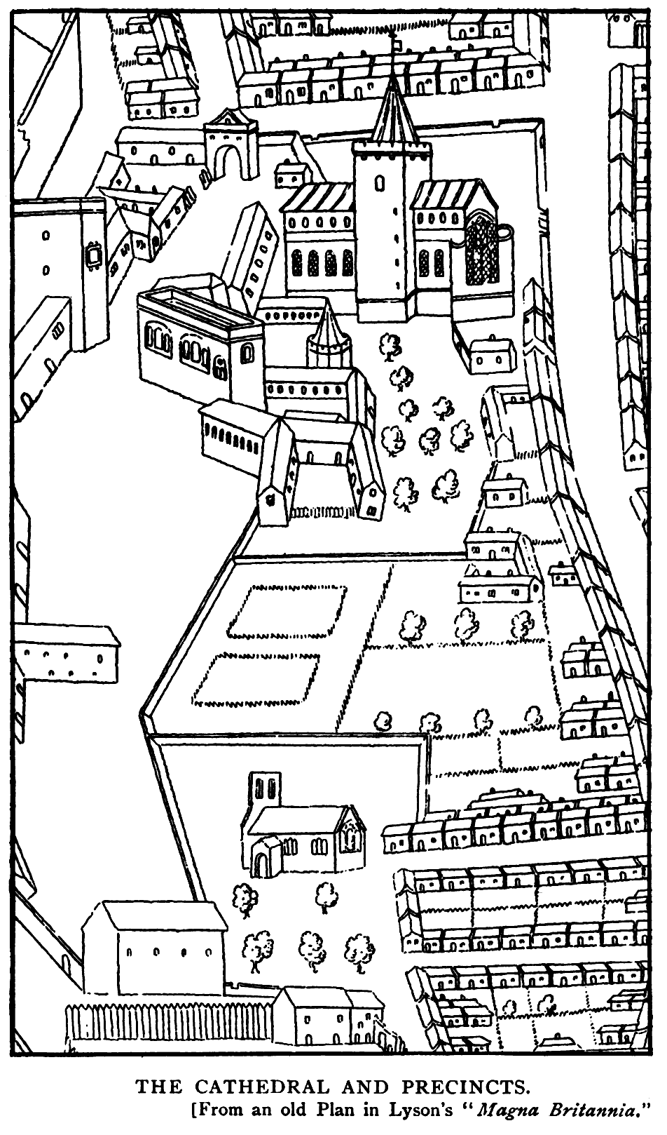 After the capture of the city in 1645 the parliamentary troops pulled down part of the nave in order to repair the fortifications. It is very probable that the Norman church was partly built of stones taken from the Roman wall; and it is strange to find the western part of the same church being destroyed nearly six hundred years after in order to repair the city walls.