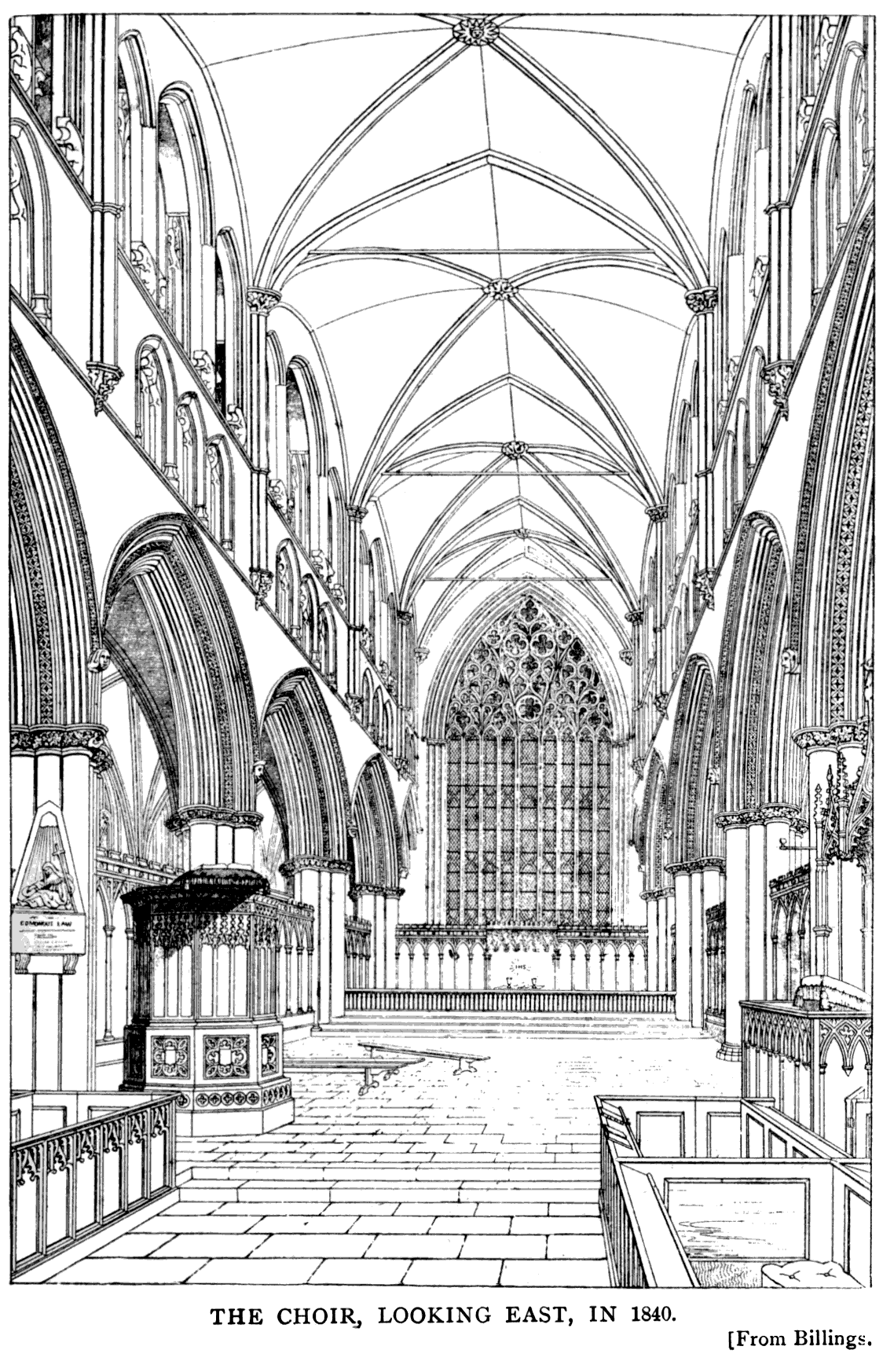 One hundred years passed away while a new choir was being built. Bishop Halton (1292-1325), a very energetic prelate, and a great favourite of Edward I., began the work, and laboured at it for quite thirty years, and was followed by Bishops Kirkby, Welton, and Appleby. It was arranged to rebuild the choir on a still larger scale, a bay being added, and the east end rebuilt from the foundation. The general plan of the earlier work of the aisles was followed in the new bay. The glory of the cathedral—the great east window, which marks a distinct transition in art—was also projected, but at this time only carried up as high as the top of the choir arches.