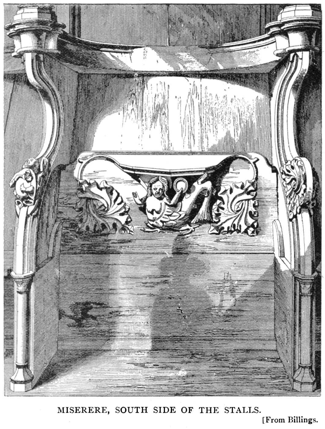 The forty-six stalls in the choir, erected on a plinth of red sandstone, belong to this period (1401-19). The elaborate tabernacle work by Prior Haithwaite (1433) was originally gilded and coloured, and the niches were filled with images.