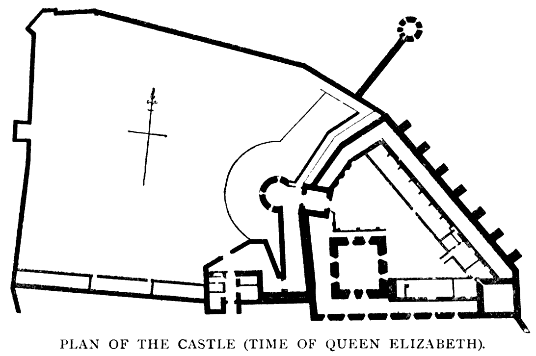 90 The two wards are divided by a strong stone wall 90 yards in length. A wide ditch (now filled up) once ran in front. In the centre of this wall is a building—the Captain's Tower—which gives access to the inner ward through its gateway secured at each end with a strong door.