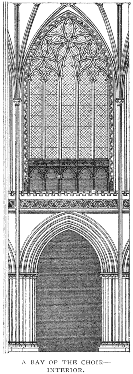 No historical document exists that can apply to the building of the nave; but that must have come next, and have been in progress almost before the north transept could have been finished. The west front was commenced somewhere about the beginning of the last quarter of the thirteenth century, and, including the two towers which form such an important part of it, must have taken a very long time to complete. From the thorough examination made when the recent restorations were in progress, it was decided that these towers were built in three distinct stages—the lowest, which just included the row of kings, being assigned to about 1280; the next stage to 1300; and the upper part, including the belfry windows, to about 1330, while the spires were not finished till some time after.
