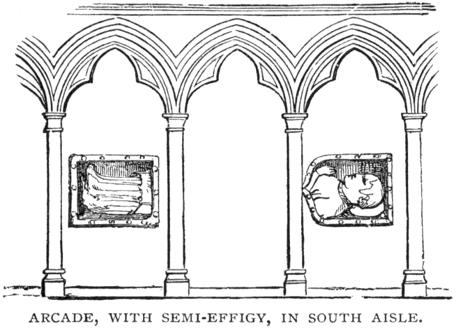The place still shows signs of its ill-usage, little having been done to repair the ravages of the Civil War. The vaulting is much broken, and the walls cracked: these facts strengthen the belief in the tradition that it was on this building, together [114] with the choir, that the great central tower fell during the siege by the soldiers of the Parliament.