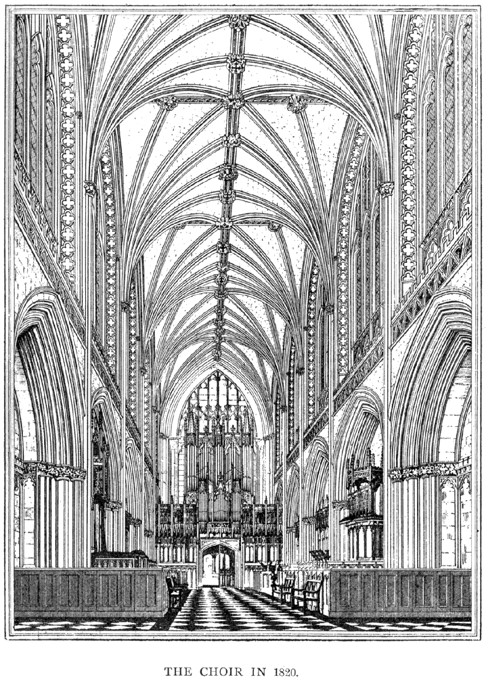 The Lady Chapel was probably erected beyond the eastern end of the church as it then stood; and while this was being done, the Early English presbytery was taken down and rebuilt in the Decorated style to match the new Lady Chapel, and the old clerestory of the choir was also rebuilt in the same style. The main idea was to obtain uniformity; but as it apparently was not proposed to take down the sacristy on the south, nor the chapter-house on the north, it was not considered necessary to pull down the choir—i.e. the last three western bays—any lower than the triforium; for the lower parts would be hidden by these buildings from the outside, and inside various shifts were resorted to to obtain uniformity. The work almost certainly grew from east to west gradually, as the clerestory of the choir end is lighter than that of the eastern or presbytery end; so that no doubt the pulling down of the old choir clerestory was only done after the building of the eastern end made it seem better to alter the rest into uniformity. With regard to the inside effect, Professor Willis says: "The front half of their pier arches (those belonging to the three western bays), however was removed and mouldings given them corresponding to those of the new presbytery. Their piers also were slightly altered, although partially concealed by the choir stalls. By these arrangements the aspect of the whole interior of the choir and presbytery was made uniform." How far this theory is sound will be seen when the alterations early in the present century are considered in their place.