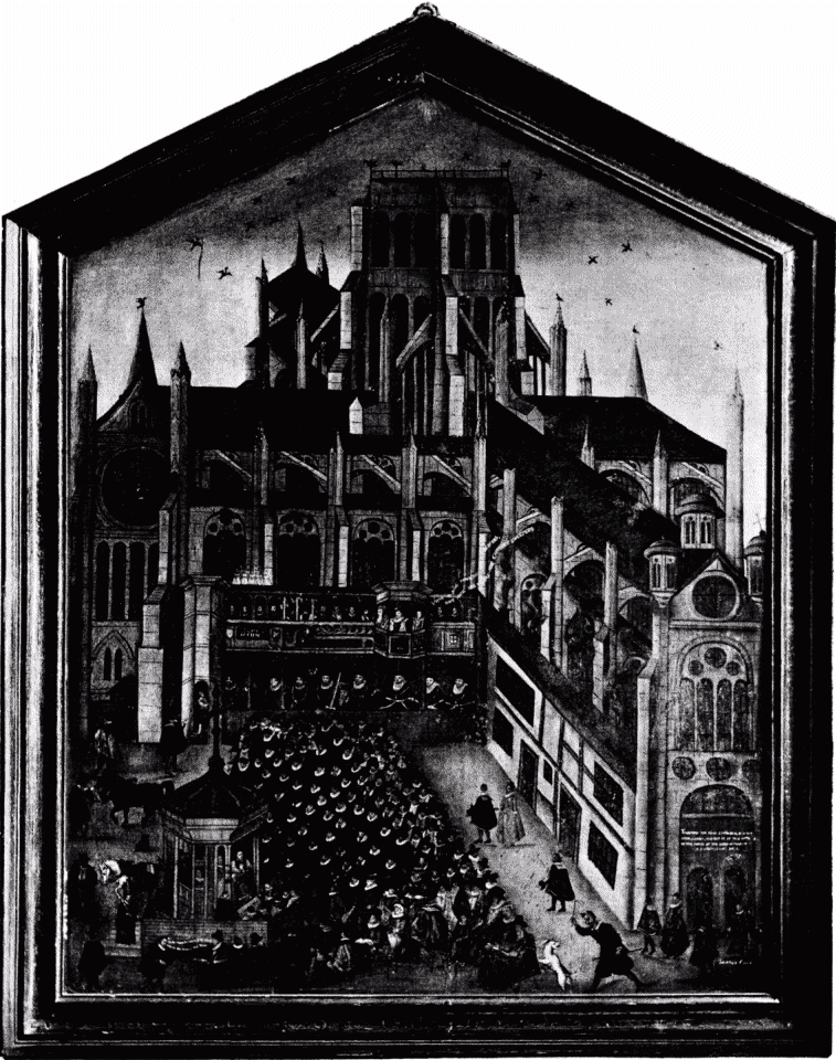 [Footnote 1: There is a very amusing little book by one Henry Farley, written in 1621, on the subject of this visit. In one paper he personates the Cathedral, and expresses his rejoicing, "I have had more sweeping, brushing, and cleaning, than in forty years before. My workmen looke like him they call Muldsacke after sweeping of a chimney." An oil painting by Farley in the collection of the Society of Antiquaries, which we reproduce by permission, shows the houses built against the cathedral, and blackening it with wreaths of smoke, to which attention is drawn by this legend across the picture:—