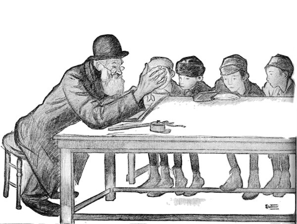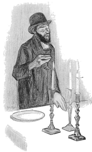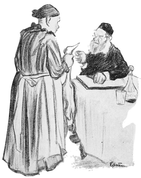 Nevertheless these influences leave the man pretty much as he was when he landed here. He remains the patriarchal Jew devoted to the law and to prayer. He never does anything that is not prescribed, and worships most of the time that he is not at work. He has only one point of view, that of the Talmud; and his aesthetic as well as his religious criteria are determined by it. "This is a beautiful letter you have written me"; wrote an old man to his son, "it smells of Isaiah." He makes of his house a synagogue, and prays three times a day; when he prays his head is covered, he wears the black and white praying-shawl, and the cubes of the phylactery are attached to his forehead and left arm. To the cubes are fastened two straps of goat-skin, black and white; those on the forehead hang down, and those attached 14 to the other cube are wound seven times about the left arm. Inside each cube is a white parchment on which is written the Hebrew word for God, which must never be spoken by a Jew. The strength of this prohibition is so great that even the Jews who have lost their faith are unwilling to pronounce the word.