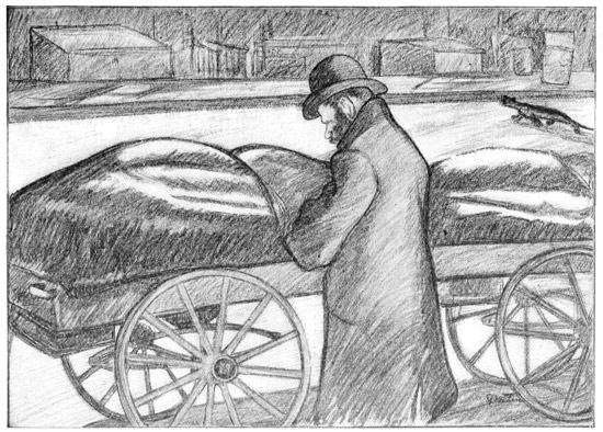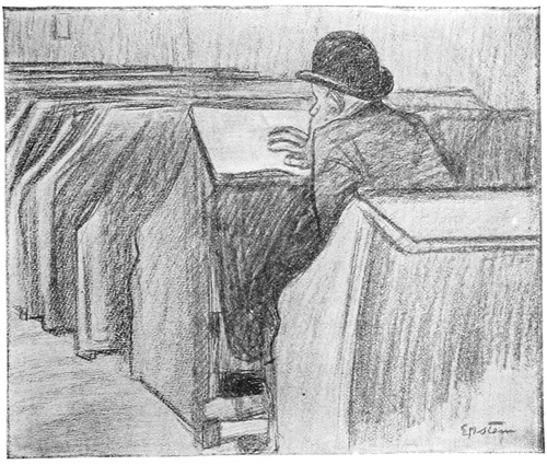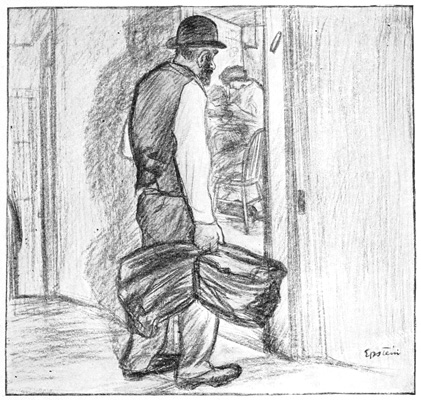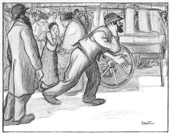 The old Jew on arriving in New York usually becomes a sweat-shop tailor or push-cart peddler. There are few more pathetic sights than an old man with a long beard, a little black cap on his head and a venerable face—a man who had been perhaps a Hebraic or Talmudic scholar in the old country, carrying or pressing piles of coats in the melancholy sweat-shop; or standing for sixteen hours a day by his push-cart in one 12 of the dozen crowded streets of the Ghetto, where the great markets are, selling among many other things apples, garden stuff, fish and second-hand shirts.