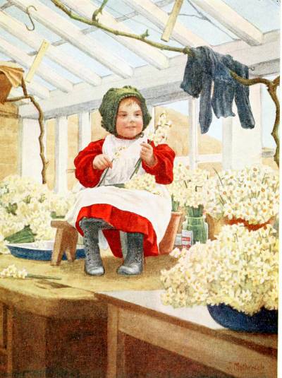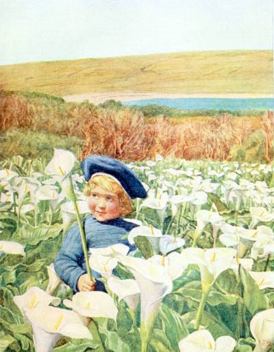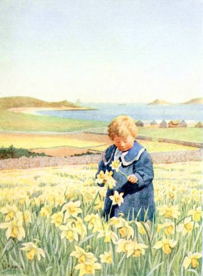 Here in Scilly we find land and sea flooded with spring sunshine, while on the “adjacent island” which we have just left every one is lamenting the cold and the rain. The flower-harvest is nearly over, yet still there are wide fields of dazzling white and yellow, and many hundreds of boxes will yet leave the quay for the mainland. The sweet-smelling Ornatus narcissus is now at its best, and its perfume fills the air. Arum-blossoms, thousands of them in a single field, stand stiffly waiting to be cut, while in the more exposed places late daffodils linger, nodding their yellow heads in the breeze that comes in from the sea. Everywhere there are flowers, flowers, flowers—such a wealth of flowers as one never saw before; and every one is either picking flowers, tying flowers, packing flowers, selling flowers, buying flowers, or talking of flowers. Even the tiny children can tell you the difference between a “‘natus” and a “Pheasant Eye”; and will talk wisely in a way to awe the less enlightened visitor of “Cynosures,” “Sir Watkins,” and “Peerless Primroses.”