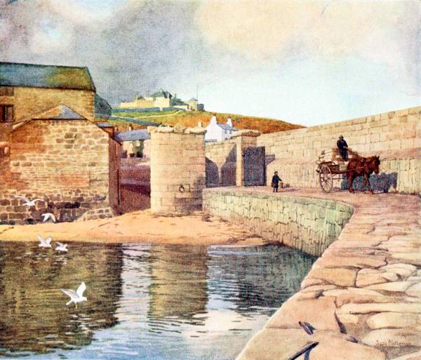 Ranulph de Blankminster appears to have fulfilled but ill his half of the compact with the King, for only two years after it was made we find William Le Peor, Coroner of St. Mary’s, making complaint of him that instead of keeping the peace he entertained rogues, thieves, and felons, and with their help committed many abuses. The King appointed a commission to inquire into the matter; but we do not learn that anything was done. The practical result of the complaint was that William Le Peor was thrown into prison by Blankminster at Le Val (supposed to be Holy Vale on St. Mary’s), and made to pay one hundred marks. So it is to be feared that he had plenty of leisure to regret his interference in the cause of justice. Judgment was rough and ready in those days. An old record of the twelfth year of[Pg 29] Edward I. tells of the drastic treatment of felons. “John de Allet and Isabella his wife hold the Isle of Scilly, and hold there all kind of pleas of the Crown, throughout their jurisdiction, and make indictments of felonies. When any one is attainted of any felony he ought to be taken to a certain rock in the sea and with two barley loaves and one pitcher of water upon the same rock they leave the same felon, until by the flowing of the sea he is swallowed up.”