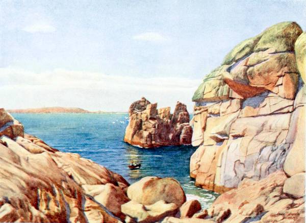 It is a wild and beautiful and lonely coast, with rounded bays, shut in by rocky headlands, and slopes clad with heather and gorse between the patches of bare grey granite. The bold mass of St. Martin’s Head is nearly the highest point of the islands, and from it what old Leland calls “the very westeste point of Cornwalle” can often be clearly seen. The Cornish hills are plainly visible on a very clear day, even from an open boat in the roads.