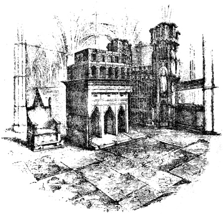 Between this Chapel and the next, is a monument of Mosaic work, erected for the children of Henry III. and Edward I. This certainly was once a rich and costly monument; for in the records of the Tower, there is the King’s order for erecting such a one in this place, and for allowing Master Simon de Wells five marks and a half to defray his expenses in bringing from the city a certain brass image to set upon the tomb of his daughter Catherine, and for paying to Simon de Gloucester, the King’s goldsmith, seventy marks, for a silver image for the like purpose.