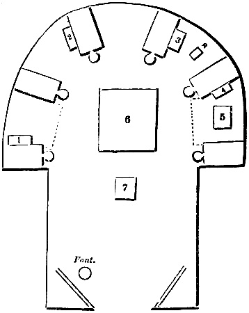 The length of the choir, from iron-gate to altar-rail, is one hundred and sixteen feet six inches; sacrarium, twenty-four feet[Pg 6] six inches; altar, fourteen feet six inches; full length, from iron-gate to altar screen, one hundred and fifty-five feet six inches; breadth, thirty-five feet six inches.
