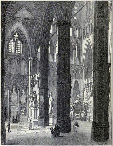 To take an advantageous view of the inside, you must go to the west door, between the towers; and the whole body of the church opens itself at once to your eye, which cannot but fill the mind of every beholder with the awful solemnity of the place, caused by the loftiness of the roof, and the happy disposition of the lights and of that noble range of pillars, by which the whole building is supported. The pillars terminate towards the east by a sweep, thereby enclosing the Chapel of Edward the Confessor in a kind of semicircle, and excluding all the rest. On the arches of the pillars are galleries of double columns, fifteen feet wide, covering the side aisles, and lighted by a middle range of windows, over which there is an upper range of larger windows: by these and the under range, with the four capital windows, the whole fabric is so admirably lighted, that the spectator is never incommoded by darkness, nor dazzled with glare.