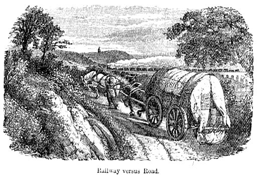 Mr. Porter, in his ‘Progress of the Nation,’ estimated that thirty millions of passengers, or about eighty-two thousand a day, travelled by coaches in Great Britain in 1834, an average distance of twelve miles each, at an average cost of 5s. a passenger, or at the rate of 5d. a mile; whereas above 448 millions are now carried by railway an average distance of 8½ miles each, at an average cost of 1s. 1½d. per passenger, or about three halfpence per mile, in considerably less than one-fourth of the time.