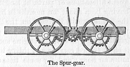 [73] Other machines, with legs, were patented in the following year by Lewis Gompertz and by Thomas Tindall. In Tindall’s specification it is provided that the power of the engine is to be assisted by a horizontal windmill; and the four pushers, or legs, are to be caused to come successively in contact with the ground, and impel the carriage!