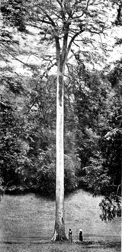 When seeds of this giant tree were first brought to England by Mr. J. D. Matthew in 1853, we Britons named it Wellingtonia in pious memory of the Iron Duke, who had breathed his last in the previous year, and that is still the name it goes by popularly with us. Americans, not less patriotically, called it Washingtonia; but we are now bidden by botanists to speak of it as Sequoia, a genus of conifers composed of only two species. Sequoia gigantea, then, is the mightiest of evergreens, for although the other species, the Redwood (S. sempervirens), may exceed it in stature, ranging to a height of 340 feet, it does not build up such an enormous trunk. The largest Redwood measured by Dr. Mayr in 1885 was 308 feet high, but not more than 46 feet in girth at 6½ feet from the ground. Its bole was clear of branches to a height of 230 feet. It may enable readers to realise these vast dimensions if they bear in mind that Messrs. Elwes and Henry have not found a tree of any kind in the British Isles 150 feet high, except the great black Italian poplar at Albury Park, and here and there a larch and spruce reaching to that stature.