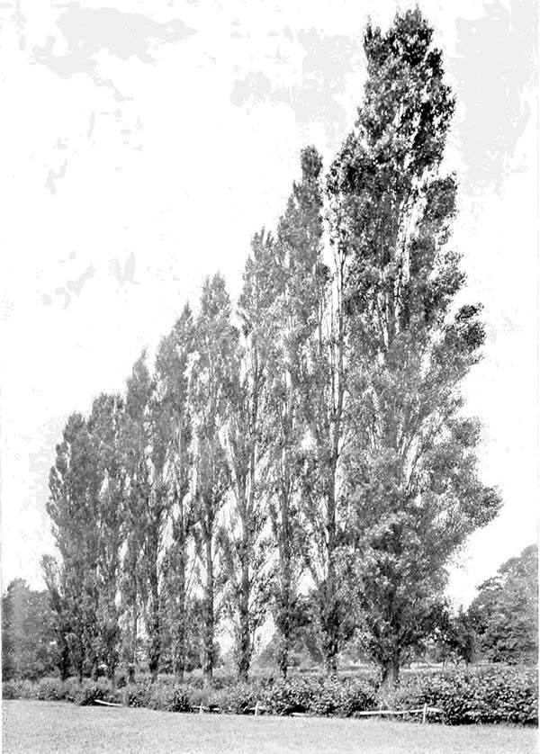Seeing that British planters must not look for any profit from the timber which is so liberally produced by the Wellingtonia, there remain only its decorative qualities to recommend it. These are considerable, provided right advantage be taken of them. Isolated specimens in sheltered places grow into majestic objects with broadly buttressed trunks and dense green curtains of leafage; but perhaps the most impressive effects are obtained by setting Wellingtonia in formal avenues. Such an avenue[225] was planted by the late Mr. Walter of Bearwood at Wellington College in 1869. This avenue is 1,200 yards long and 25 yards broad; the trees were planted 54 feet apart, and as they now average 80 feet high, and are clothed with verdure from the ground to the summit, the effect is very stately and impressive.