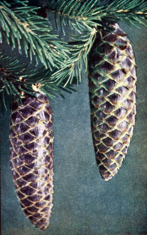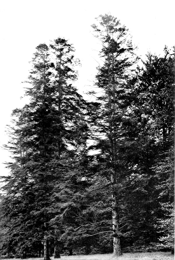The Mediterranean cypress is only hardy in the mildest parts of the United Kingdom, and is therefore[216] not suitable for general planting;[26] but it has many relatives worthy of earnest attention from our foresters. About forty years ago the late Mr. Peter Lawson, of the Goldenacre Nurseries, Edinburgh, told me he expected that the American Thuja lobbi (as it was then called) was destined to surpass all other conifers for British planting. The name of this tree has been repeatedly changed; perhaps it is most commonly known as Thuja gigantea; but the Kew authorities have decreed of late that its right name is T. plicata. In British Columbia, Oregon, and Washington, where it is of more commercial importance than any other tree, except the Douglas fir, it is known as Red Cedar; which does not help much towards identification, as it is quite distinct from any true cedar. In its native forests it soars to a stature of 200 feet; and, although not brought to this country until 1853, has already reached a height of 100 feet in some places. The most striking example known to me of its behaviour under forest treatment in this country is at Benmore, on the Holy Loch, where about 2,000 acres were planted in successive seasons, 1871-78, and consist now chiefly of this Thuja and Douglas Fir. It is a tree most easily raised from seed, which it produces freely in this country, and it is most easily handled in the nursery. About twelve years ago I raised about 70,000 from[217] 15s. worth of seed; but the bulk of these, having been planted on low-lying, damp ground, succumbed to severe spring frost; while the remainder, planted on higher dry ground, now average 20 feet high. Of the timber, Professor Sargent, the leading authority on North American forestry, reports: "The wood is very valuable; it is light, soft, easily worked, and so durable in contact with the ground or when exposed to the elements, that no one has ever known it long enough to see it decay." Mr. Elwes has given a remarkable photograph of a western hemlock spruce (Tsuga mertensiana) at least one hundred years old, growing astride of an enormous trunk of Thuja, which is still quite hard and sound (Trees of Great Britain, vol. i., plate 59). I feel convinced that when the fine qualities of this tree are better known, it will largely replace European larch in our woodlands.