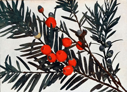 The poisonous properties of the yew are pretty generally known; in fact, Pliny says that the adjective toxicus, poisonous, was once written taxicus from taxus, the yew. But in the English Encyclopædia is the mischievous statement—"It is now well known that the fruit of the yew may be eaten with impunity." It is quite true that the pulp surrounding the seed, with its sweet but sickly taste, does not possess the poisonous properties of the foliage and young bark; but the seed itself is deadly, numerous fatal cases having been recorded as the result of swallowing it. On the whole, therefore, it is best to give children nice chocolates on condition that they leave the pretty yew berries alone.