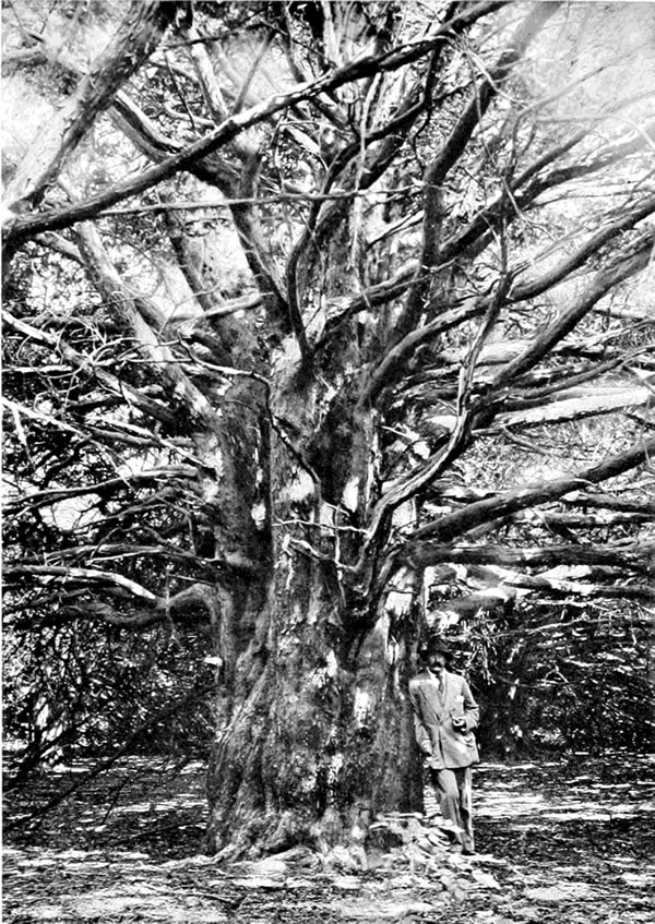 The practice of planting yews in churchyards helps to account for the extravagant statements about the age of certain trees. Generation after generation has become familiar with seeing a yew beside the parish church; the date of the building of the church being accurately known, it comes to be assumed that church and tree are coeval. Dr. Lowe gives a case in point of two churches in contiguous parishes in Kent, each of which has a large yew in the churchyard reckoned to be the same age as the church. One of these yews measures 16 feet in girth, the other 17 feet; but as one of the churches dates back to the eleventh century, and the other only to the fourteenth, the tradition about the trees would have one yew to be three hundred years older than[212] the other, although only differing in girth by one foot.[24]