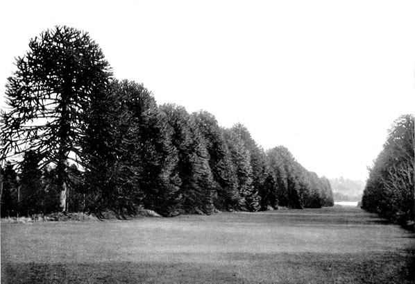 AVENUE OF ARAUCARIA IMBRICATAVery different in habit and appearance from the lightsome gingko is the araucaria or puzzle monkey, but, like the former, it is a survival of the vegetation that flourished in the carboniferous era, when it had to compete with giant ferns, cycads, and horse-tails, and attained its utmost development in the Jurassic landscape. Of the ten known species of araucaria, all indigenous only in the southern hemisphere, only one is hardy in Great Britain—A. imbricata—which forms forests on the mountains of southern Chile.