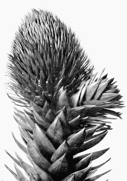 ARAUCARIA IMBRICATA Female Flower Again another effect. On the west shore of Loch Fyne, united to the mainland by a narrow neck of shingle, is Barmore Island, a grassy, rocky pile, treeless save for a solitary araucaria which some freakish hand has planted many years ago high on the northern slope. The impression received from this lonely foreigner is very enduring. (Let me not be misunderstood.[235] I do not mean the physical impression, which would be distinctly disagreeable; but the mental one, which is most pleasing.)