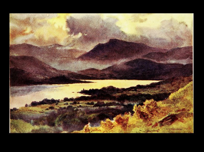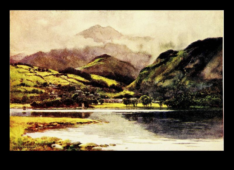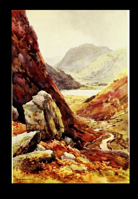 Stern and wild enough under the shadow of night or beneath stormy skies, Crummock thrusts its gradually narrowing point deep into richer scenes of woody foot-hill, and radiant meadow, overlooked by the picturesquely perched old hostelry of Scale Hill, familiar to generations of Lakeland tourists. And here the Cocker leaps rejoicing and in fuller volume to sparkle down the long, lovely vale of Lorton towards its junction with the Derwent at Wordsworth's birthplace. A mile or so to the westward Loweswater lies bewitchingly in the lap of fells, but overhung upon one bank for its entire length by the opulent foliage of Holm Wood, and lacking the more rugged features which dominate the others, seems to lie somewhat aloof from them in quality as it does in fact.
