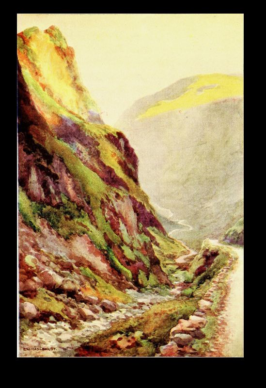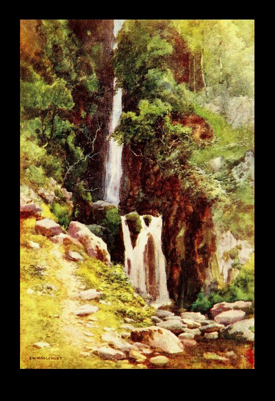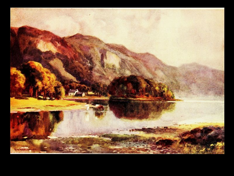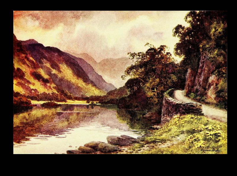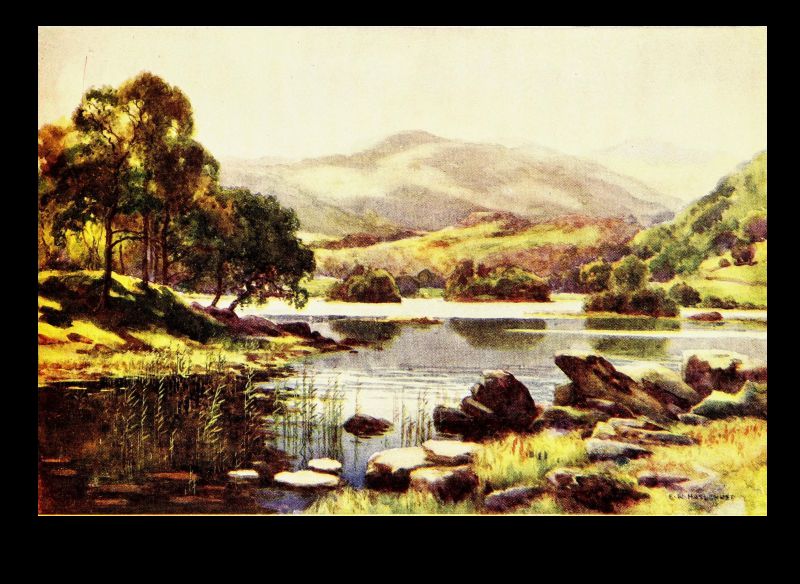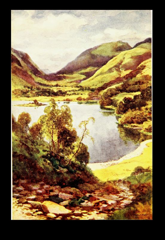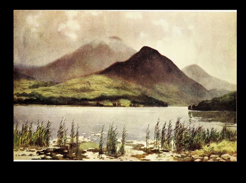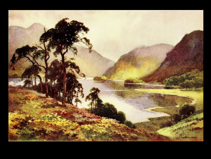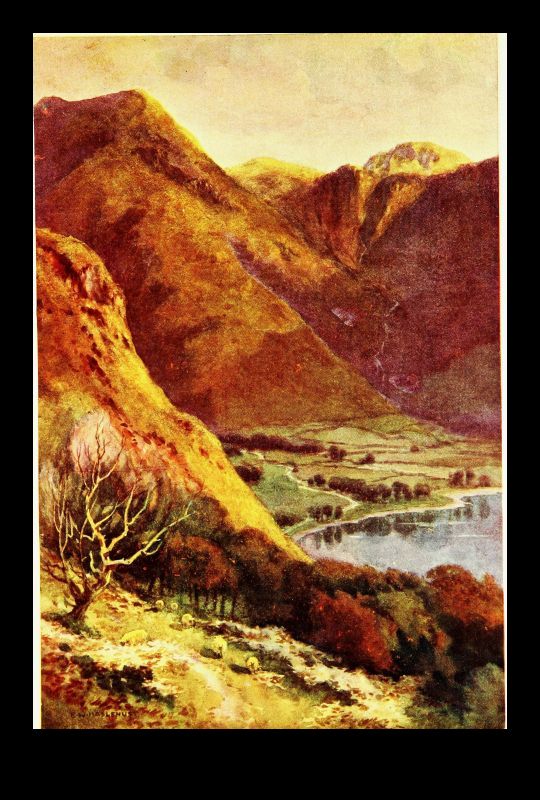 But let us turn to gentler themes, noting for a moment Stybarrow, the foot of which is the subject of our artist's skill. There is very little of the Border foray tradition in the heart of the Lake country. It was obviously unprofitable as well as risky to the aggressor. But a body of Scots did once, at least, make a dash on Patterdale and on Stybarrow, which is in a sense its gateway, and met their fate. If the eastern shore of the upper half of Ullswater is inspiring from its solitary grandeur of overhanging mountain, its feathered cliffs and promontories, its indented rocky coves, its western shore holds one's affections by its gentler and more sylvan beauties. For after the picturesque confusion of mossy crag and forest glade around Stybarrow, beneath which the lake lies deep and dark, the two large demesnes—"chases" would best describe them—of Glencoin and Gowbarrow slope gently down from the back-lying mountains to the curving shore. Here are pleasant silvery strands overhung with tall sycamores and oaks; there are rocky shores[Pg 34] fringed with hazel and alder, where the crystal waters of this most pellucid of large lakes breaks sonorously when a gale is blowing. The little becks come tumbling in too over the sloping meadows from the fells—that of Glencoin of familiar name, and that of Aira of greater fame for its waterfall, whose hoarse voice can be heard on still evenings on the lake, and for the legend embodied in Wordsworth's well-known poem. Here, too, behind the long grassy promontory with pebbly shore that roughly marks the entry to this upper and more beautiful four miles of lake, is Lyulph's tower. Not a very ancient fabric, to be sure, but marking the site of that shadowy keep where dwelt the sleep-walking, love-lorn maiden, who perished in the pool below Aira Force in the arms of her errant knight, as he arrived only just in time to drag her expiring to the shore.