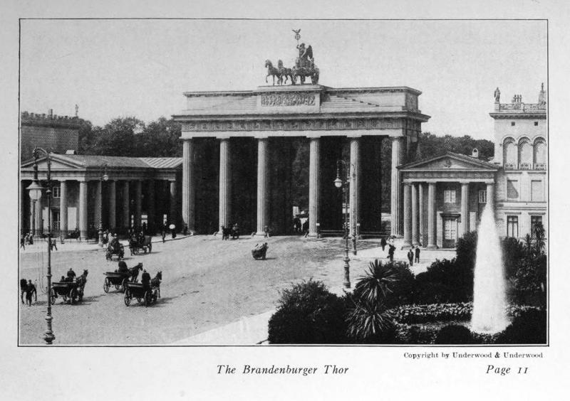 These policemen looked like soldiers. In Berlin one is always surrounded by a military atmosphere. The city is the product and the producer of this martial spirit. The Prussian wars are written so completely in[Pg 12] pages of bronze and marble, one has the impression of being among people who are on the verge of war and prepared for it. Even as we glided along, a huge Zeppelin air ship hovered above us, one of those ill-fated war machines which have so often met destruction.