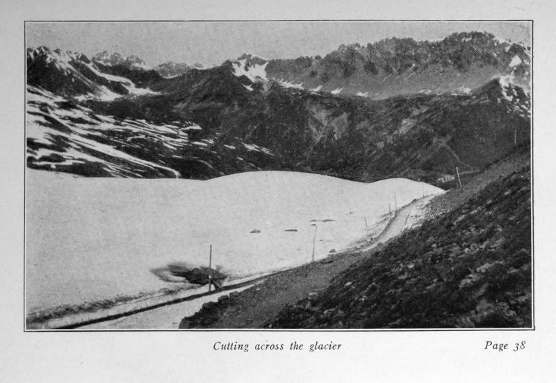On descending to arrange customhouse details with the Austrian officials, we found the car frozen in the ice. The hot steel-studded tires had melted a deep groove, and were now held fast in the prison of their own making. Even on the Stelvio we had not expected to be frozen fast on the first of August. In vain we opened wide the throttle. The wheels turned furiously without gaining an inch. Austrian soldiers came to our rescue. Half a dozen of us pushed from behind. Two American tourists who had just climbed the Stelvio from the Italian side in a Cadillac, also gave generous aid. With the additional help of pickaxes and quantities of sawdust, the car finally shook off its icy fetters.
