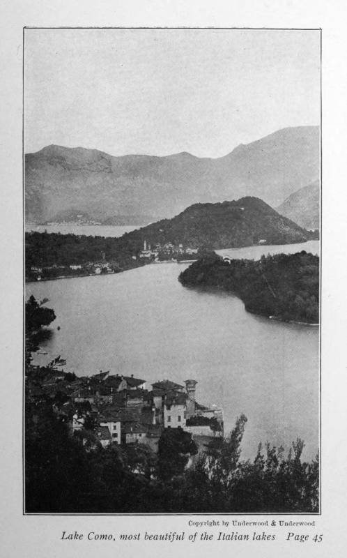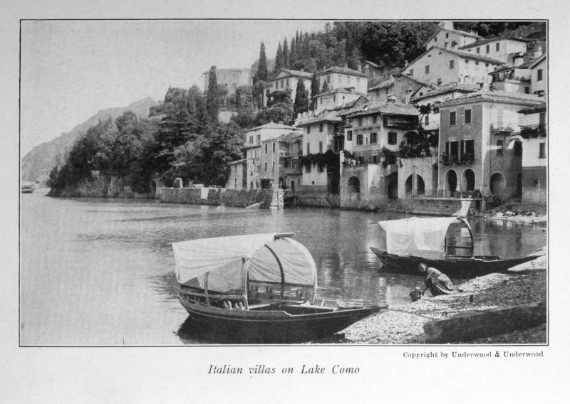 The sun was a glowing disk upon the horizon when we reached Colico upon Lake Como, most beautiful of the Italian lakes. There was a crimson light on the water. Red sails drifted lazily toward the shore. Across the lake the high mountains rose cone-like to a peak, like extinct volcanoes. From a distant bell tower floated the clear, sweet tones of the angelus. Before some of the houses, young Italians were playing melodies on guitars. Twilight was falling, that wonderful twilight so full of color and feeling, of the romance and sentiment of northern Italy. After several miles along the shore, through these fascinating scenes, we reached Menaggio.