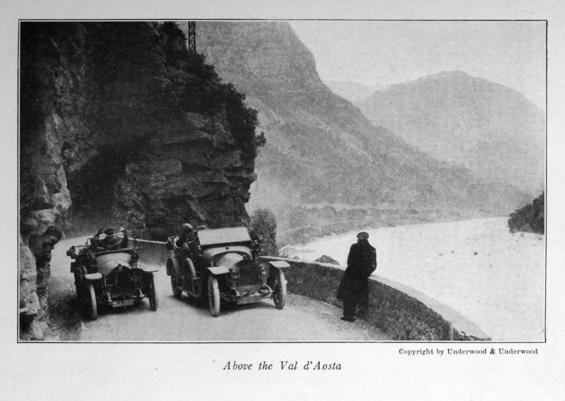 When the Austrians built this road, a century ago, they were not thinking about motor cars. This masterpiece of road construction was intended for armies, not for automobiles. The makers of those curves, cut through heights of solid rock, never anticipated the luxurious modes of modern travel. If then they had only foreseen the coming of motor warfare, how much inconvenience would have been spared the impetuous motorist who to-day attempts to climb the Stelvio in a long, powerful car which cannot quite make the turns without backing. Surely, a few feet would have been added to those tantalizing, agonizing curves. How little the Austrians realized that their military invasion would be followed by the more peaceful motor invasion of our day.