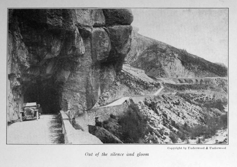 We were coasting much of the time; gasoline[Pg 42] and ignition had been cut off. Rocky walls hurled back the blast of our motor horn as we entered the slippery winter galleries of the Diroccamento defile. According to law, no vehicle may enter a tunnel if it is occupied. Farther down, the road looped like the coils of a great serpent, twisting, disappearing, only to reappear farther down as a faint streak of shimmering roadway. It was curious, that sensation of falling, always sinking lower and yet never reaching the bottom. One more sweep through the Braulio Valley, and we stopped for lunch before the luxurious hotel Bagni-Nuovi, that popular watering place for the leisure rich of Italy.