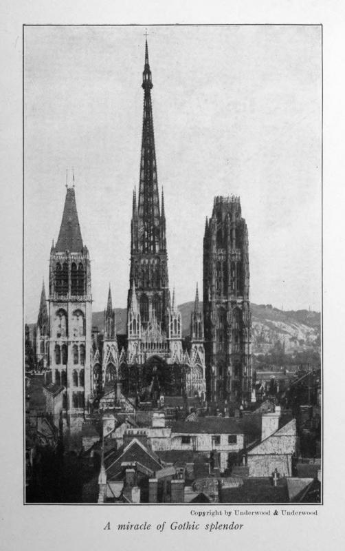 The central tower rises into a great spire of open iron work, more than one and a half times as high as the steeple of Trinity Church in New York. One seldom sees anything so quaintly picturesque as the little wooden cloister, Aître Saint-Maclou. From its courtyard, the burial ground for so many victims of the Black Death of 1348, one sees mediæval spires which rise in all directions. Another vivid reminder of the past is the archway of the Grosse Horloge, with its huge clock in colors of blue and gold and dating from the sixteenth century.