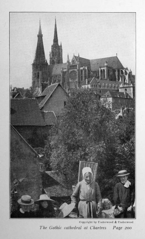 Little Chartres is overshadowed by its mighty cathedral. All interest concentrates there. Many consider it the finest in France. Every one would agree that the interior is incomparable. Nowhere can we find a more sublime expression of Gothic art. Those who fashioned this "sacred rock-work set to music" belong to the great unknown; their names are buried somewhere back in the early part of the thirteenth century when the cathedral was built. At least, they have given us a picture of their times; such structures could not be erected now. Our age is attuned to a different key; there are too many distracting influences. Then, there were no popular theaters, and few books or forms of amusement. The church was the natural center of thought and life. Only the religious inspiration of a people naturally artistic could have created the immortal works which the cathedral builders have bequeathed.