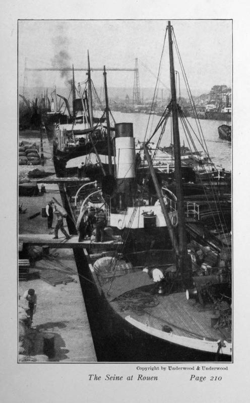 For nearly twenty miles the road cut a white swath through the treeless plain of St. André to the cathedral town of Evreux. The wheat fields and cathedrals of Normandy should be mentioned in the same sentence. France, so full of the picturesque, has few finer sights than the view of these airy cathedral spires while one is still miles away from any town. We zigzagged into the valley of Iton, climbed, swooped downward, and crossing that hurrying stream, ran beside the river Eure into the main street of Louviers. The warning, "Allure modère," was unnecessary. The cobble stones were sufficient to make us slacken speed. The beauty of the church of Nôtre Dame served to stop us completely. The church, with its profuse embroidery of rich, delicate carving, shone like a jewel amid the motley and jumbled houses. It was like finding a rosebush blooming in the gutter of some neglected street. Through the forest of Pont de l'Arche to the town of the same[Pg 210] name, where we crossed the Seine, past bright little Norman cottages, our route shot ahead to Rouen, the center of cotton manufacturing for France, the most interesting mediæval city in Normandy, and renowned the world over for splendid Gothic churches. After inspecting the rooms of two or three hotels, we chose the Hôtel d'Angleterre, close by the crowded traffic of the Seine.