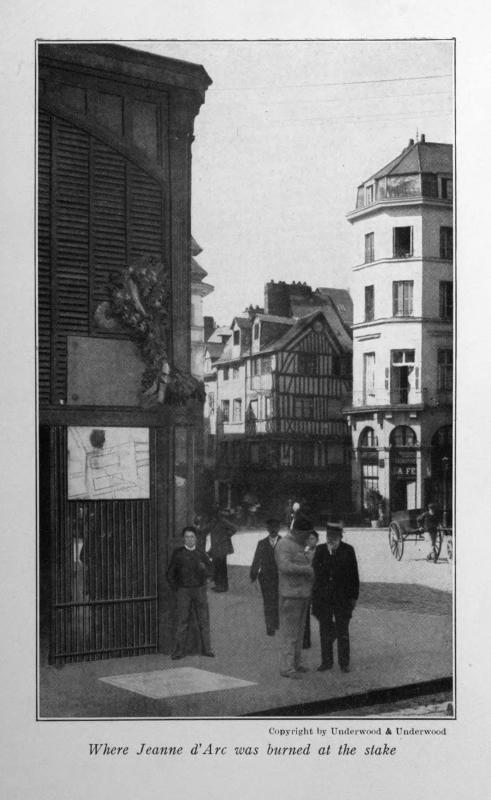 But the impressions of Rouen that thrilled us most related to the sad closing days of Jeanne d'Arc. At Orléans we saw her in the hour of victory, a young girl dictating to experienced generals, cutting her way through the English army around the city and bringing provisions and succor to the beleaguered inhabitants.[Pg 212] Our cocher escorted us to the tower where, with instruments of torture around her, she faced and baffled her brutal inquisitors. In the old market place, the scene of her martyrdom, one is shown a simple slab which reads, "Jeanne d'Arc, 30 Mai, 1431." This marks the spot where she was burned at the stake.