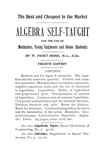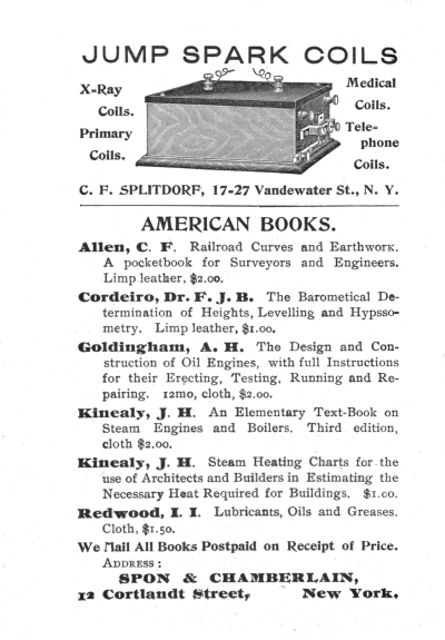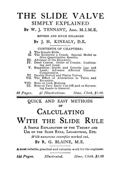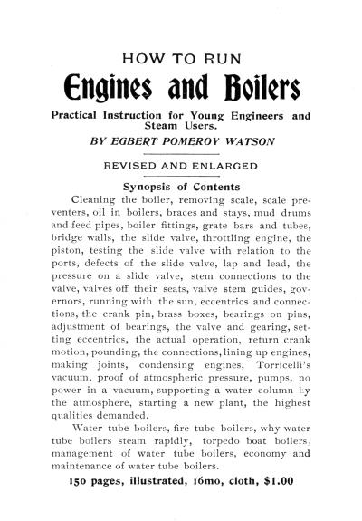 Cleaning the boiler, removing scale, scale preventers, oil in boilers, braces and stays, mud drums and feed pipes, boiler fittings, grate bars and tubes, bridge walls, the slide valve, throttling engine, the piston, testing the slide valve with relation to the ports, defects of the slide valve, lap and lead, the pressure on a slide valve, stem connections to the valve, valves off their seats, valve stem guides, governors, running with the sun, eccentrics and connections, the crank pin, brass boxes, bearings on pins, adjustment of bearings, the valve and gearing, setting eccentrics, the actual operation, return crank motion, pounding, the connections, lining up engines, making joints, condensing engines, Torricelli’s vacuum, proof of atmospheric pressure, pumps, no power in a vacuum, supporting a water column by the atmosphere, starting a new plant, the highest qualities demanded.