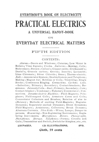 | Electrical Rules—Electromotive force—Amperes—Resistance—Selecting a battery—Arrangement of battery—Series—Multiple—How to get high voltage or large current—The Leclanche Cell—The Samson Cell—The Dry Cell and how to make one—The Edison-Lalande Cell—The Fuller Cell—Care and maintenance of batteries | 78 |
