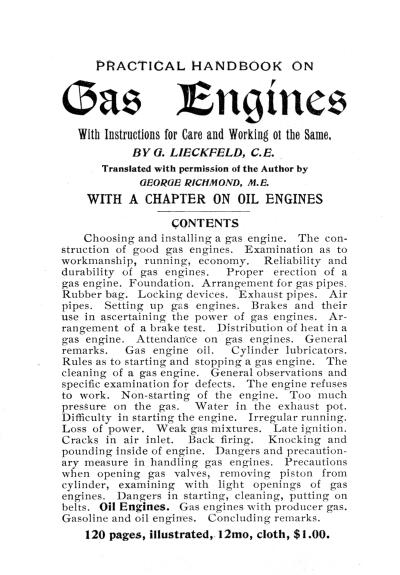 Choosing and installing a gas engine. The construction of good gas engines. Examination as to workmanship, running, economy. Reliability and durability of gas engines. Proper erection of a gas engine. Foundation. Arrangement for gas pipes. Rubber bag. Locking devices. Exhaust pipes. Air pipes. Setting up gas engines. Brakes and their use in ascertaining the power of gas engines. Arrangement of a brake test. Distribution of heat in a gas engine. Attendance on gas engines. General remarks. Gas engine oil. Cylinder lubricators. Rules as to starting and stopping a gas engine. The cleaning of a gas engine. General observations and specific examination for defects. The engine refuses to work. Non-starting of the engine. Too much pressure on the gas. Water in the exhaust pot. Difficulty in starting the engine. Irregular running. Loss of power. Weak gas mixtures. Late ignition. Cracks in air inlet. Back firing. Knocking and pounding inside of engine. Dangers and precautionary measure in handling gas engines. Precautions when opening gas valves, removing piston from cylinder, examining with light openings of gas engines. Dangers in starting, cleaning, putting on belts. Oil Engines. Gas engines with producer gas. Gasoline and oil engines. Concluding remarks.