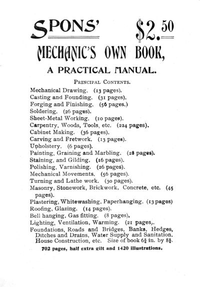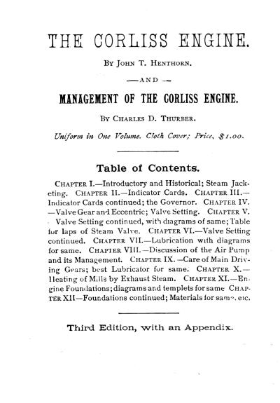 Chapter I.—Introductory and Historical; Steam Jacketing. Chapter II.—Indicator Cards. Chapter III.—Indicator Cards continued; the Governor. Chapter IV.—Valve Gear and Eccentric; Valve Setting. Chapter V.—Valve Setting continued, with diagrams of same; Table for laps of Steam Valve. Chapter VI.—Valve Setting continued. Chapter VII.—Lubrication with diagrams for same. Chapter VIII.—Discussion of the Air Pump and its Management. Chapter IX.—Care of Main Driving Gears; best Lubricator for same. Chapter X.—Heating of Mills by Exhaust Steam. Chapter XI.—Engine Foundations; diagrams and templets for same. Chapter XII.—Foundations continued; Materials for same, etc.