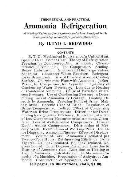 B. T. U. Mechanical Equivalent of a Unit of Heat. Specific Heat. Latent Heat. Theory of Refrigeration. Freezing, by Compressed Air. Ammonia. Characteristics of Ammonia. The Compressor. Stuffing-Boxes. Lubrication. Suction and Discharge Valves. Separator. Condenser-Worm, Receiver. Refrigerator or Brine Tank. Size of Pipe and Area of Cooling Surface. Charging the Plant with Ammonia. Jacket-Water, for Compressor, for Separator. Quantity of Condensing Water Necessary. Loss due to Heating of Condensed Ammonia. Cause of Variation in Excess Pressure. Use of Condensing Pressure in Determining Loss of Ammonia by Leakage. Cooling Directly by Ammonia. Freezing Point of Brine. Making Brine. Specific Heat of Brine. Regulation of Brine Temperature. Indirect Effect of Condensing Water on Brine Temperature. Directions for Determining Refrigerating Efficiency. Equivalent of a Ton of Ice. Compressor Measurement of Ammonia Circulated. Loss of Well-Jacketed Compressors. Loss in Double-Acting Compressors. Distribution of Mercury Wells. Examination of Working Parts. Indicator Diagrams. Ammonia Figures—Effectual Displacement. Volume of Gas. Ammonia Circulated per Twenty-Four Hours. Refrigerating Efficiency. Brine Figures—Gallons Circulated. Pounds Circulated. Degrees Cooled. Total Degrees Extracted. Loss due to Heating of Ammonia Gas. Loss due to Heating of Liquid Ammonia. Calculation of the Maximum Capacity of a Machine. Preparation of Anhydrous Ammonia. Construction of Apparatus, etc., etc.