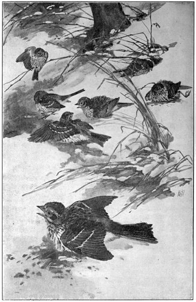 Fox sparrows: See the frontispiece. The largest, most beautiful of our sparrows. Nests in the Far North. A migrant to New England and the Southern States.