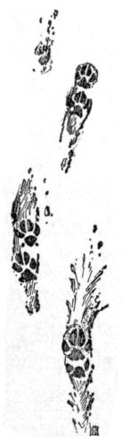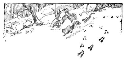What interested us here in the woods was the fact that a second series of tracks, just like the first, except that they were only about half as large, dogged the larger tracks persistently, leaping tree for tree, and landing track for track with astonishing accuracy—tracks[Pg 11] which, had they not been evidently those of a smaller squirrel, would have read to us most menacingly.