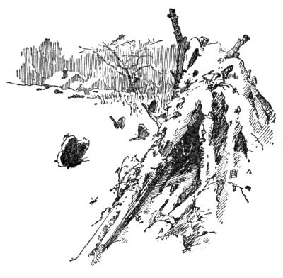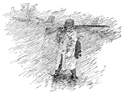 Along the stone wall of the meadow we tracked him, across the highroad, over our garden, into the orchard, up the woody hill to the yard, back down the hill to the orchard, out into the garden, and back toward the orchard again; and here, on a knoll just at the edge of the scanty, skeleton shadow where the sunlight fell through the trees, we lost him.