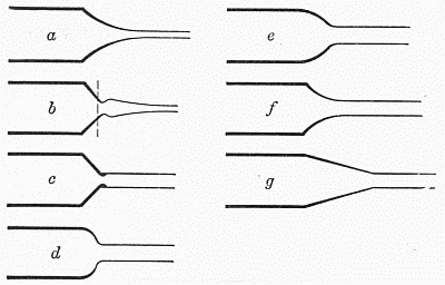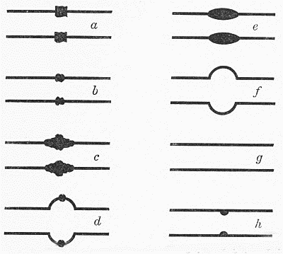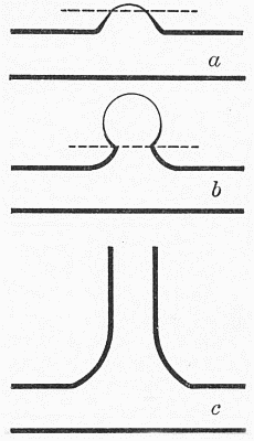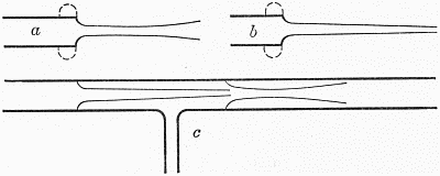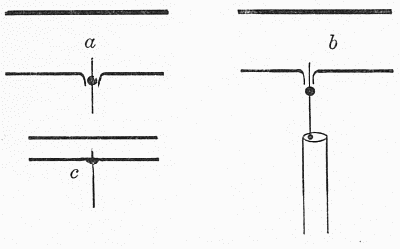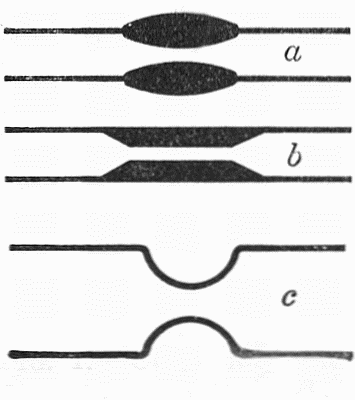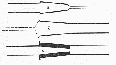tube.This method of constriction is not suited to tubes much over 1⁄4 inch in diameter, since the mass of glass in the constricted part becomes so thick as to be difficult to handle when hot, and likely to crack on cooling. Larger tubes are therefore constricted by heating in a narrow flame, with constant rotation, and when soft, alternately gently pulling the ends apart and pushing them together, each motion being so regulated that the diameter of a short section of the tube is gradually reduced, while the thickness of the wall of the reduced portion remains the same as that of the rest of the tube, or increases only slightly. This pulling and pushing of the glass takes place in the flame, while the rotation is[Pg 11] being continued regularly. The result may appear as indicated in c, Fig. 1. The strength of the work depends upon the thickness of the walls of the constricted portion, which should never be less than that in the main tube, and usually a little greater. This operation is most successful with tubing having a relatively thin wall.