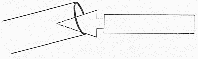 Some glass-blowers use a small carbon rod, about 3⁄16 inch in diameter, as a flanging tool for tubes larger than about 3⁄8 inch diameter, and a small iron wire or similar piece of metal for smaller tubes. In this case the tube is heated as above described, and the rod or wire inserted in the end at an angle and pressed against the softened part, as indicated in Fig. 4, while the tube is[Pg 13] rotated about its axis. For large heavy tubes a larger carbon would be used.